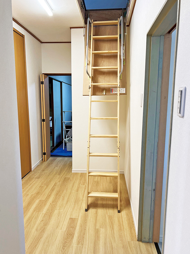 2階へと続く階段を屋根裏へ収納できる「小屋裏階段」へ切り替え。